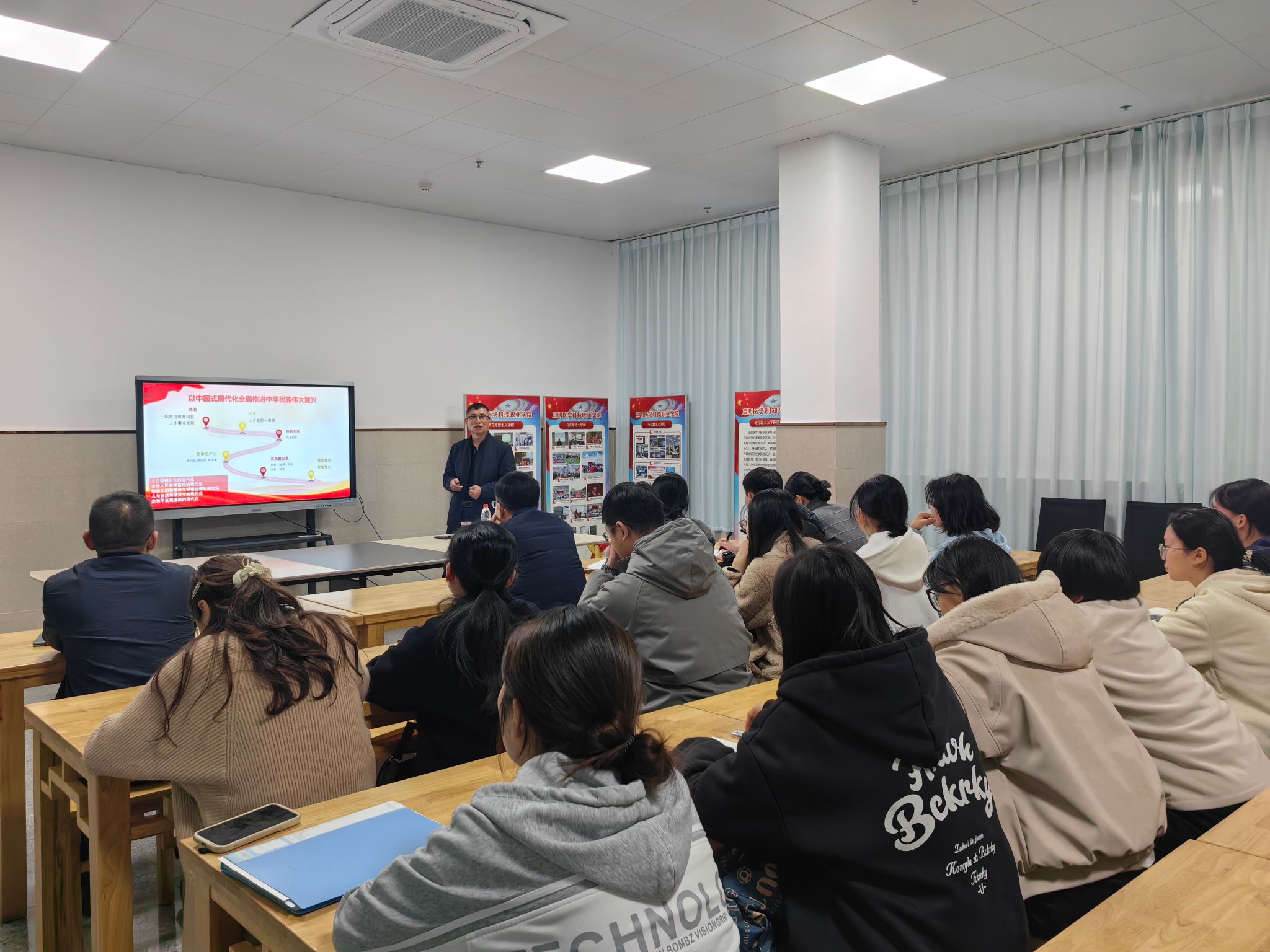 今日下午16:20,马克思主义学院特邀中共三明市委宣传部副部长、讲师团团长、马院思政课特聘教授陈首龙作题为“党的二十届四中全会精神解读”的专题辅导报告。马克思主义学院教师及习近平新时代中国特色社会主义读书社骨干成员参加学习。