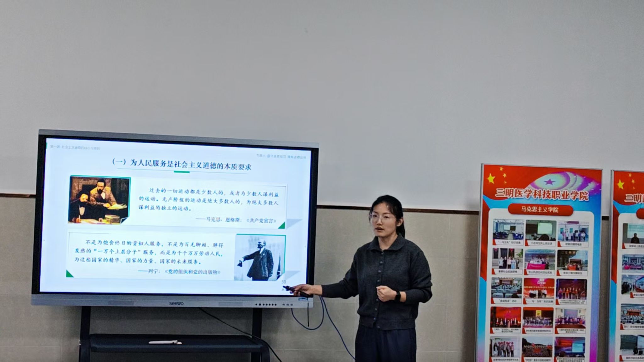 备课会上,乔璐璐老师以《思想道德与法治》第五章第一节“社会主义道德的核心与原则”为题,进行了40分钟的教学展示。乔璐璐老师和数字人助教明奇奇一同围绕“人为什么需要道德?”“社会主义道德为什么是先进的?”“为人民服务高不可攀吗?”三个议题进行授课,让学生在崇德向善的实践中不断锻炼道德品质、提升道德境界。