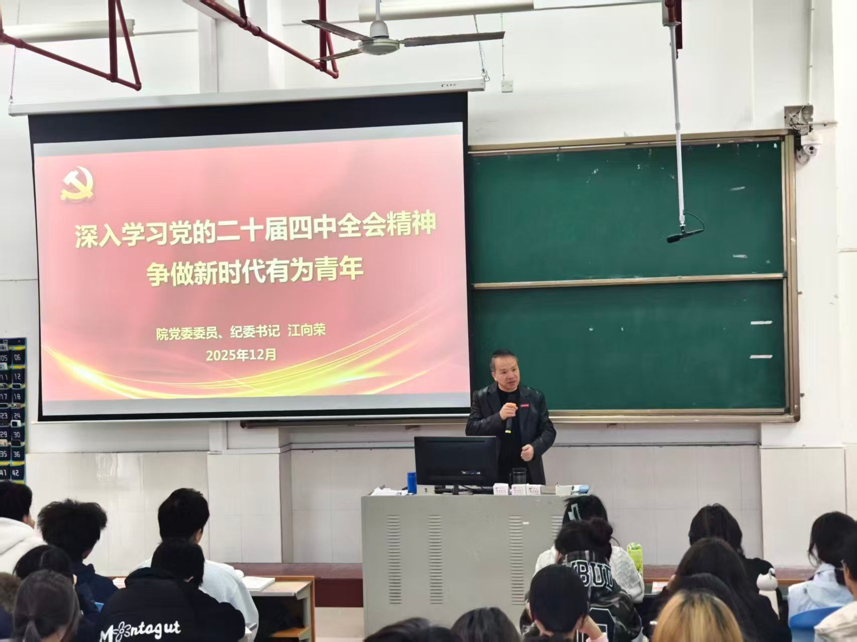 12月9日下午,院纪委书记江向荣走进2025级智慧养老和2022级智慧养老五年专2班思政课堂,专题宣讲党的二十届四中全会精神。