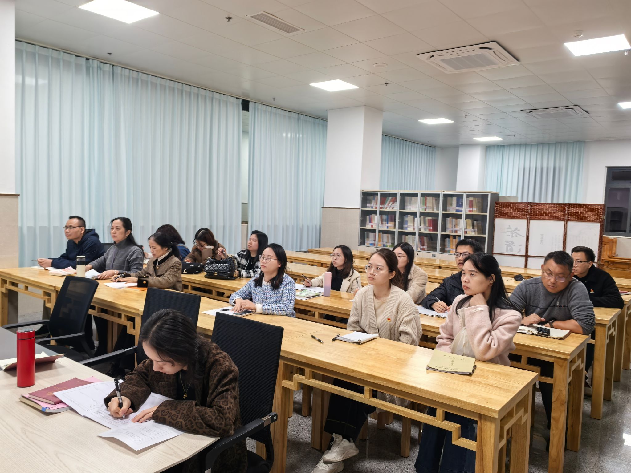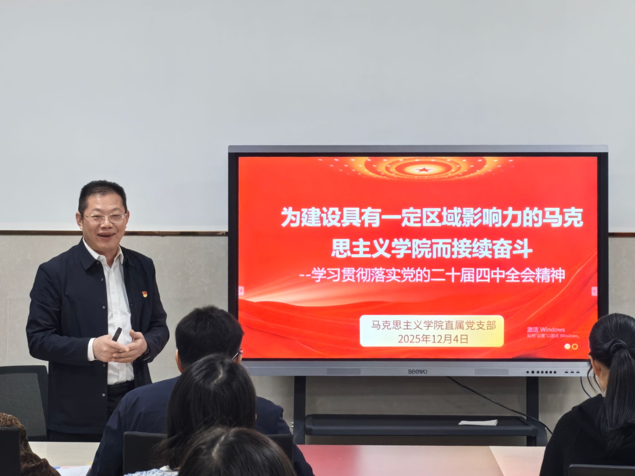 12月4日,马克思主义学院直属党支部举行专题党课学习,深入学习贯彻二十届四中全会精神。党支部书记陈成吨同志以“为建设具有一定区域影响力的马克思主义学院而接续奋斗”为题授课。