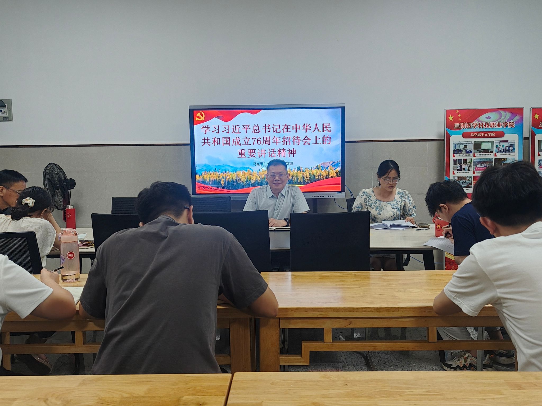 10月13日,马克思主义学院直属党支部召开专题学习会,深入学习习近平总书记在庆祝中华人民共和国成立76周年招待会上的重要讲话精神。支部全体党员参加学习,并结合思想政治理论课教学实际开展深入研讨。